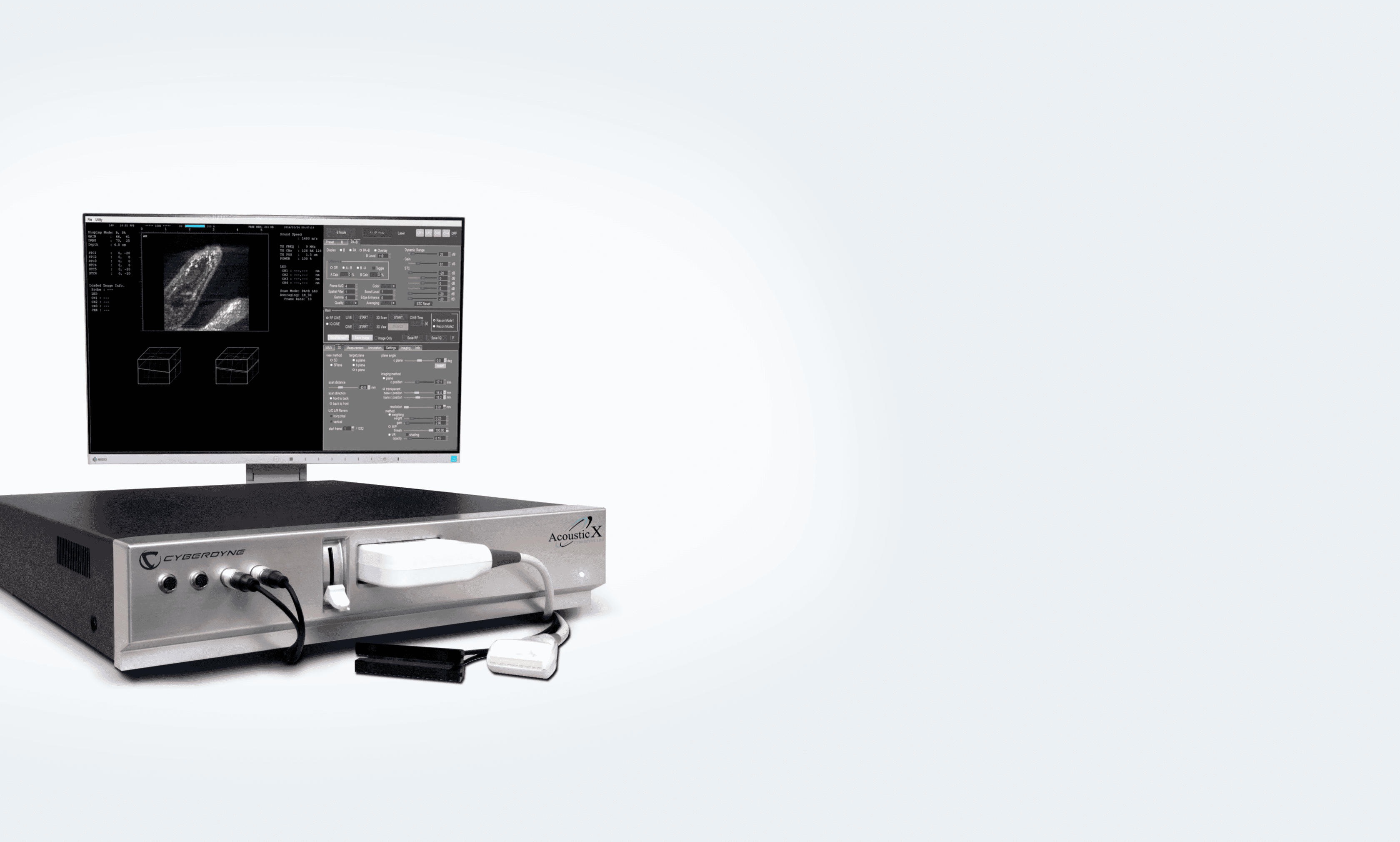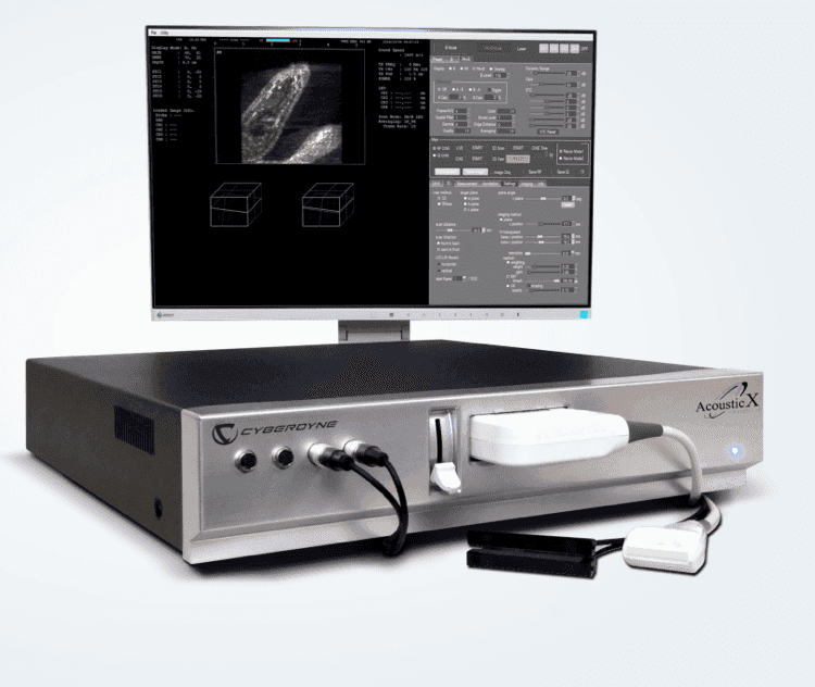 Acoustic X ist ein photoakustisches Bildgebungsgerät. In Echtzeit werden Bilder des in vivo Absorber durch Senden von LED Impulsen und erkennen der Ultraschallabgabe, dem sogenannten photoakustischen Effekt, konstruiert. Durch die Auswahl verschiedener LED Wellenlänge und die Einbindung der Ultraschallaufnahme wird der Ort der Zielsubstanz visualisiert.